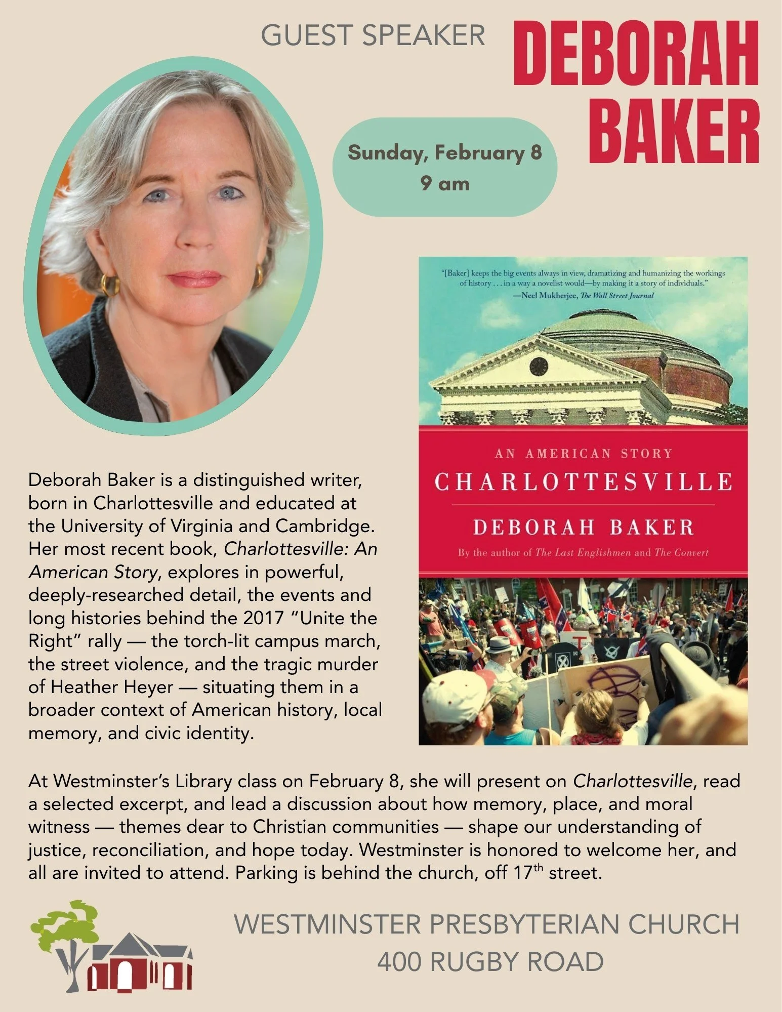 At Westminster’s Library class on February 8 at 9 am, we will welcome Deborah Baker as our guest speaker. Ms. Baker is a distinguished writer, born in Charlottesville and educated at the University of Virginia and Cambridge. Her most recent book, Charlottesville: An American Story, explores in powerful, deeply-researched detail, the events and long histories behind the 2017 “Unite the Right” rally — the torch-lit campus march, the street violence, and the tragic murder of Heather Heyer — situating them in a broader context of American history, local memory, and civic identity. Her previous works include In Extremis: The Life of Laura Riding (a Pulitzer Prize finalist), The Convert: A Tale of Exile and Extremism, A Blue Hand: The Beats in India, and The Last Englishmen: Love, War, and the End of Empire.